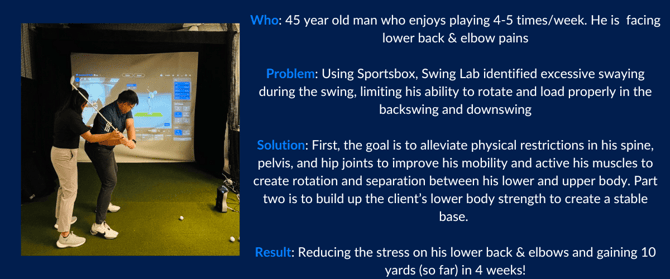 Each client’s journey at Swing Lab begins with a detailed assessment of mobility, stability, strength, neuromuscular control, and joint loading patterns during the golf swing. Michele and her team use 3D data from Sportsbox to identify relationship between physical restrictions, such as hip immobility or trunk rotation issues with the golfer's swing characteristics. Through 3D, they can breakdown how the body is being utilized in the swing and identify the root causes to improve the body movements for a more efficient swing. From there, clients follow a tailored plan involving manual therapy, exercises, and drills to optimize movement. After therapy, Michele uses Sportsbox to verify how these changes translate into improved swing mechanics, creating a clear connection between body function and golf performance.
